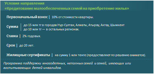 Семьям, которые не имеют средств на оплату первоначального взноса, будет предоставлена возможность получения жилищных сертификатов (по решению местных акиматов). Номинал сертификата — 1 млн тенге.