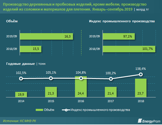 Производство деревянных и пробковых изделий за три квартала текущего года составило 16,3 млрд тг, индекс промышленного производства к соответствующему периоду прошлого года показал сокращение выпуска — всего 97,1%. Годом ранее производство составляло 15,5 млрд тг, при ИПП в 101,7%.