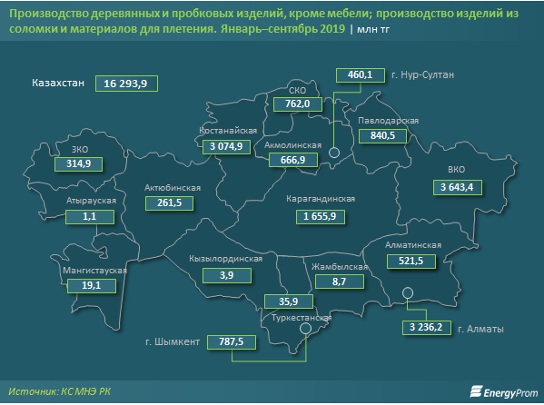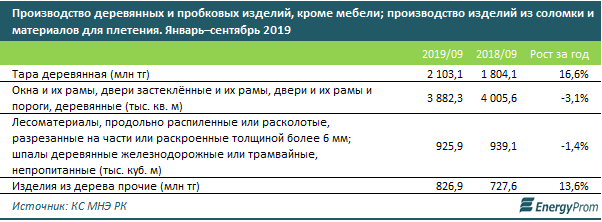 В то же время зафиксирован заметный рост производства деревянной тары: за год плюс 16,6%, до 2,1 млрд тг. Выпуск прочих изделий из дерева увеличился на 13,6%, до 826,9 млн тг.