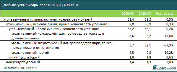 Добыча каменного угля и лигнита, включая угольный концентрат, за 4 месяца составила 38,4 млн тонн — на 0,5% больше, чем за январь–апрель 2019 года. Добыча непосредственно каменного угля выросла на 0,2%, до 35,2 млн тонн.