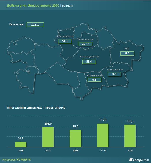 При росте в реальных объёмах добыча угля в стоимостном выражении за январь–апрель 2020 года составила 113,1 млрд тг, против 115,5 млрд тг годом ранее.