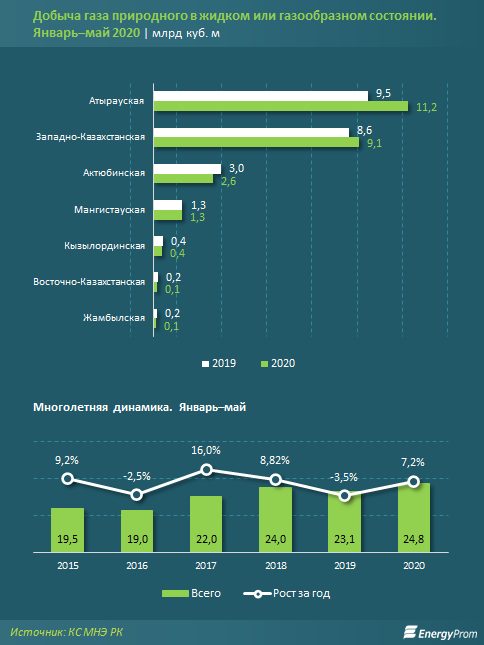 За январь–май 2020 года добыча природного газа в жидком или газообразном состоянии достигла 24,8 млрд куб. м — на 7,2% больше, чем в аналогичном периоде годом ранее. На долю природного газа в газообразном состоянии пришлось 40,3% добычи, или 10 млрд куб. м, на долю нефтяного попутного газа — 59,7%, или 14,8 млрд куб. м. В денежном выражении добыча природного газа составила 141,9 млрд тг.