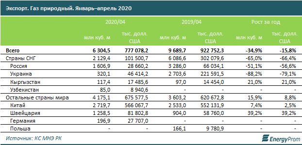 Непосредственно природного газа Казахстан экспортировал за январь–апрель 2020 года 6,3 млрд куб. м, годовое сокращение экспорта составило 34,9%. Впрочем, в стоимостном выражении сокращение экспорта в секторе — лишь на 15,8% за год, до 777,1 млн долл. США.