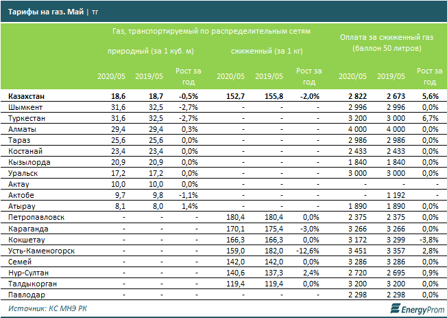 На внутреннем рынке страны цена на природный газ, транспортируемый по распределительным сетям, составила 18,6 тг за 1 куб. м — минус 0,5% за год. Цена на сжиженный газ, транспортируемый по распределительным сетям, составила 152,7 тг за 1 кг — минус 2% за год. Цена на сжиженный газ в баллонах по 50 литров увеличилась на 5,6%, до 2,8 тыс. тг.