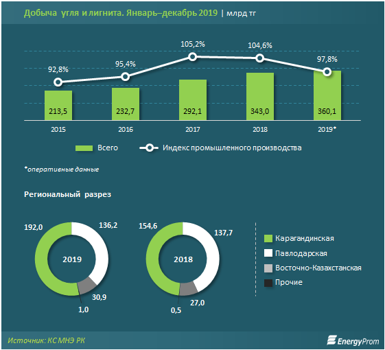 Угледобыча в РК ведётся в трёх ключевых регионах: в Карагандинской области (192 млрд тг за январь–декабрь 2019-го, против 154,6 млрд тг в аналогичном периоде предыдущего года, 53,3% от РК); в Павлодарской области (136,2 млрд тг, против 137,7 млрд тг годом ранее, 37,8% от РК); в Восточно-Казахстанской области (30,9 млрд тг, против 27 млрд тг год назад, 8,6% от РК).