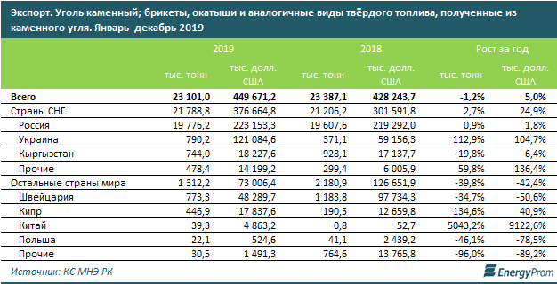 За 12 месяцев прошлого года из страны экспортировали 23,1 млн тонн угля (минус 1,2% к показателю предыдущего года) на 449,7 млн долларов (плюс 5%).