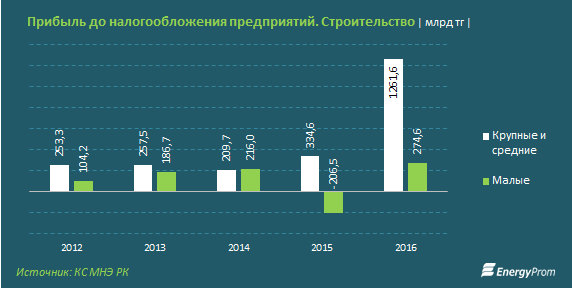 Причем рекордный рост прибыли показали как крупные стройкомпании, так и малые предприятия. Так, за 2016 год крупные и средние предприятия отрасли зафиксировали прибыль до налогообложения в размере 1,3 трлн тенге. Это почти в 4 раза больше уровня 2015 года.