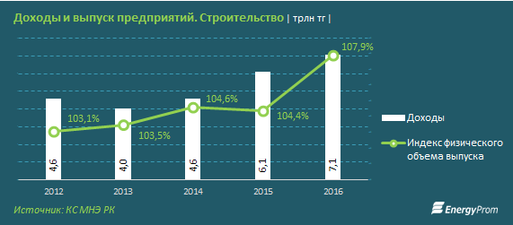 Совокупные доходы стройсектора в 2016 году выросли на 16% и превысили 7 трлн тенге, в том числе у крупных и средних предприятий — 4,4 трлн и 2,7 трлн тенге у малого сектора.