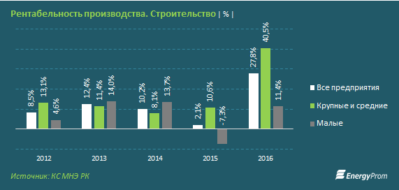 Резкий рост прибыли был обусловлен увеличением темпов активности в строительстве — в 2016 году объем выпуска продукции в отрасли увеличился на 7,9% при общем росте ВВП РК всего на 1,3%. Напомним, строительство в 2016 году стало одним из немногих драйверов роста национальной экономики.