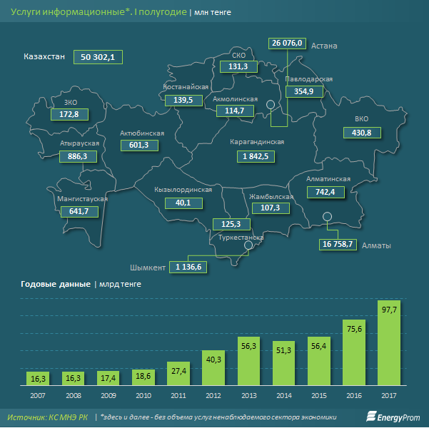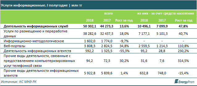 По итогам первого полугодия объем информационных услуг в РК достиг 50,3 млрд тг — это сразу на 13,6% больше, чем в аналогичном периоде годом ранее.