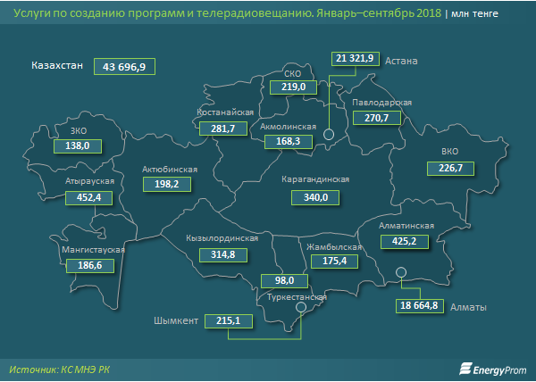 По итогам трёх кварталов 2018 года услуги по телерадиовещанию и созданию программ сократились в денежном выражении на 2,5%, до 43,7 млрд тг. Для сравнения, в аналогичном периоде 2017 года показатель увеличился на 2,3%, почти до 45 млрд тг. Основной объём услуг традиционно приходится на Астану (48,8% от РК, 21,3 млрд тг, −10,2% за год) и Алматы (42,7% от РК, 18,7 млрд тг, +6,7% за год).