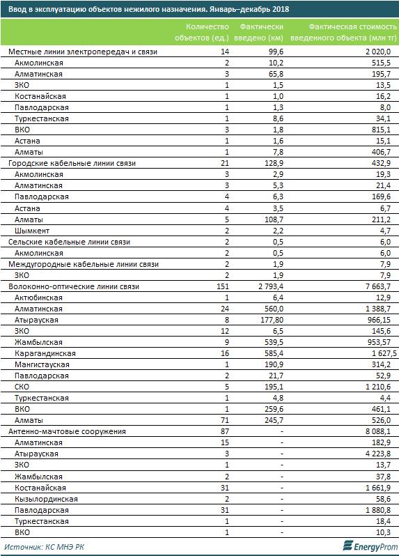 В целом по итогам 2018 года в стране было проложено 99,6 км местных линий электропередач и связи на 2 млрд тг; 128,9 км городских кабельных линий связи на 432,9 млн тг; 500 м сельских кабельных линий связи на 6 млн тг; 1,9 км междугородних кабельных линий на 7,9 млн тг. Кроме того, проложено 2793,4 км волоконно-оптических линий связи на 7,7 млрд тг и введено в эксплуатацию 87 антенно-мачтовых сооружений на 8,1 млрд тг.