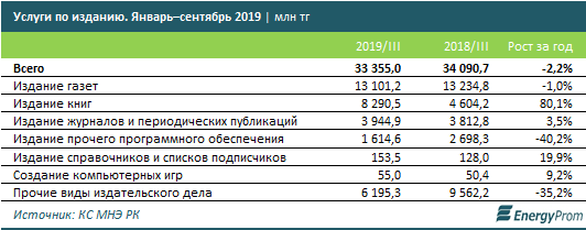 Самый развитый сегмент — издание газет: здесь сконцентрировано 39,3% услуг в секторе (12,1 млрд тг). На втором месте издание книг (8,29 млрд тг, или 24,9% от общего объёма услуг), на третьем — издание журналов и прочих периодических публикаций (3,94 млрд тг, или 11,8%).