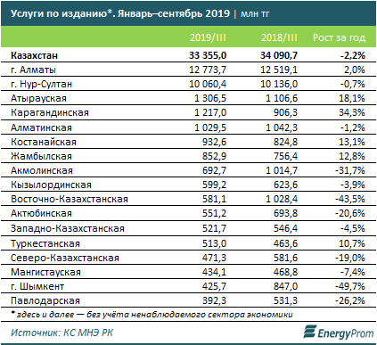 Замыкает тройку регионов по наибольшему объёму издательских услуг Атырауская область: 1,31 млрд тг, против 1,11 млрд тг год назад.