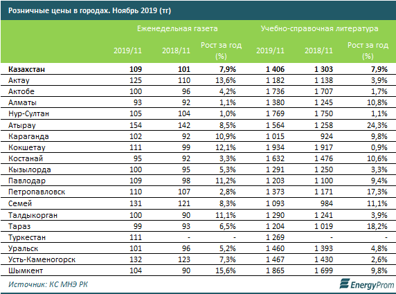 Еженедельные газеты по итогам ноября текущего года в среднем по городам РК стоили 109 тг — на 7,9% больше, чем годом ранее. Самые дорогие газеты приходилось покупать жителям Атырау, Усть-Каменогорска и Семея.