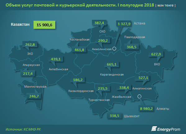 По итогам I полугодия объем услуг почтовой и курьерской деятельности составил сразу 15,9 млрд тг — это на 7,1% больше, чем годом ранее.