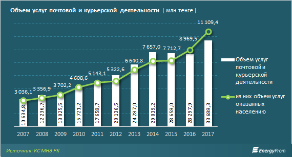 Из них 11,1 млрд тг пришлось на население — это 33% от всего объема почтовых и курьерских услуг, против 31,7% в 2016 году.