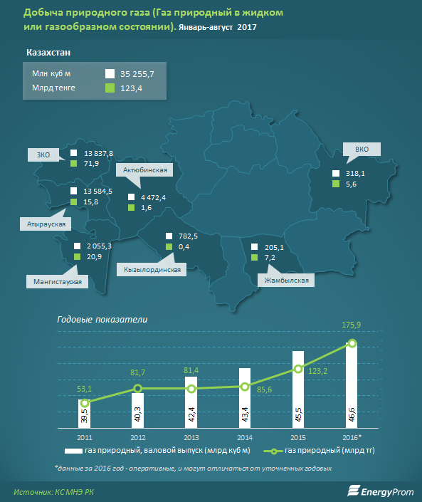 В натуральном выражении добыча природного газа достигла 35,3 млрд куб м — сразу на 17,3% больше, чем в аналогичном периоде годом ранее. Из них 19,7 млрд куб м составил нефтяной попутный газ, и еще 15,4 млрд куб м — естественный природный газ в газообразном состоянии (при этом товарный выпуск составил 8,6 млрд куб м). Среди областей лидируют ЗКО — 13,8 млрд куб м газа, из которых естественного газа в газообразном состоянии — 13,5 млрд куб м.
