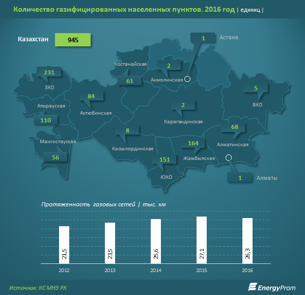 По итогам прошлого года в стране газом (включая сжиженный) обеспечено 88,5% жилфонда, при этом в городах — 83,3%, в селах — 97,4%. Количество газифицированных населенных пунктов достигло 945 — на 2,1% больше, чем годом ранее. Наилучшие показатели — в ЗКО (231 населенный пункт), Жамбылской области (164 населенных пункта, +1,2% за год) и ЮКО (151 населенный пункт).