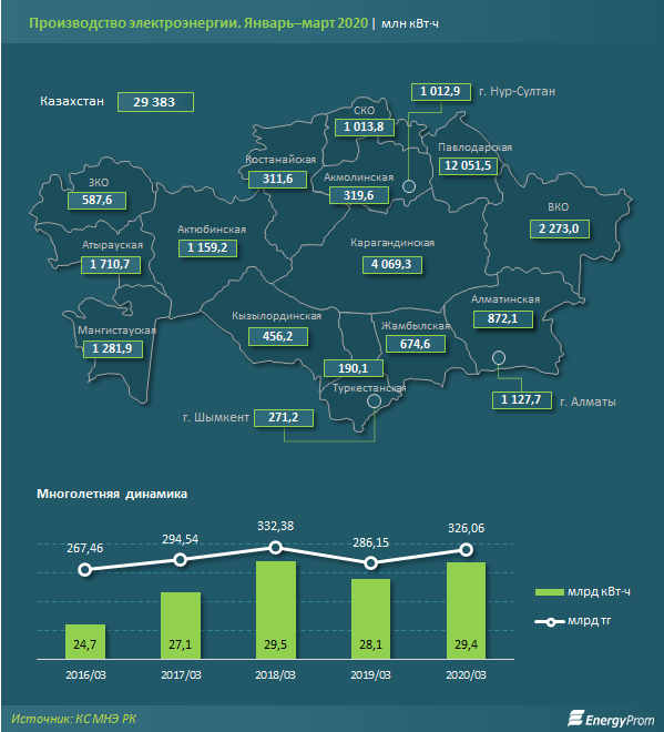 За январь–март 2020 года в Казахстане произвели 29,4 млрд кВт·ч электроэнергии — на 4,5% больше, чем в январе–марте 2019-го. 62,6% всего производства электроэнергии пришлось на Павлодарскую (12,05 млрд кВт·ч), Карагандинскую (4,07 млрд кВт·ч) и Восточно-Казахстанскую (2,27 млрд кВт·ч) области.