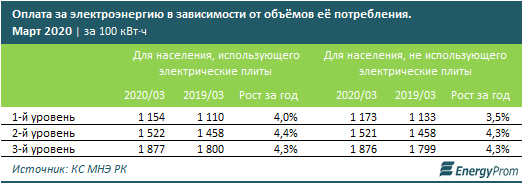 Годовой рост тарифов на электроэнергию для населения в марте 2020 года составил 4% (месячное удорожание — 0,3%). Так, стоимость электроэнергии для населения, использующего электрические плиты, увеличилась на 1-м уровне потребления на 4% за год, на 2-м уровне — на 4,4%, на 3-м уровне — на 4,3%. Для населения, не использующего электрические плиты, тарифы на 1-м уровне потребления выросли на 3,5%, на 2-м и 3-м уровне — на 4,3%.