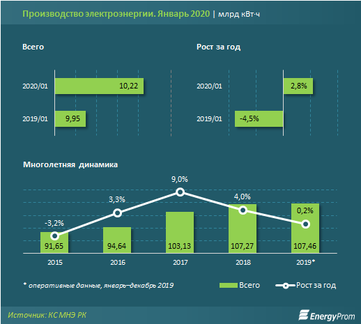 За январь электростанции РК произвели 10,22 млрд кВт·ч электроэнергии — на 2,8% больше, чем в январе 2019-го. Для сравнения: за первый месяц прошлого года было произведено 9,95 млрд кВт·ч электроэнергии — на 4,5% меньше, чем в соответствующем месяце 2018-го.