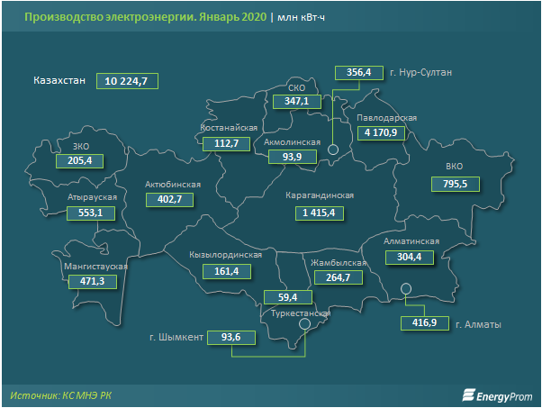 По показателям генерации электроэнергии традиционно лидируют промышленная Павлодарская (4,2 млрд кВт·ч за январь 2020-го, плюс 3% за год), Карагандинская ( 1,4 млрд кВт·ч, плюс 3,3 %) и Восточно-Казахстанская (795,5 млн кВт·ч, плюс 1%) области.