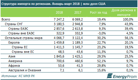 Наибольший объем поставок в РК ведется из стран СНГ (43,9%), в частности, крупнейшие импортеры — страны-партнеры по ЕАЭС (сразу 39,4%).