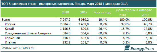 Среди стран-импортеров в Казахстан главный поставщик продукции на рынки страны — Россия (37% импорта).