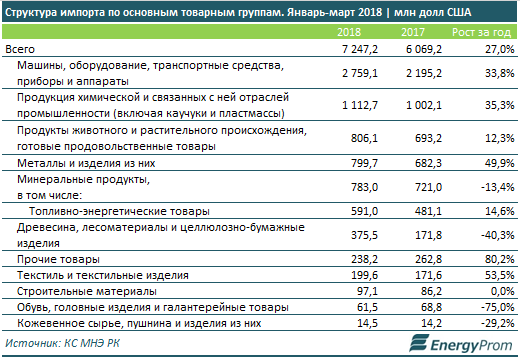 Наиболее важные товарные группы, заводимые в РК — машины и оборудование (38,1% от всего импорта), продукция химпрома (15,4%) и продукты АПК и пищепрома (11,1%).