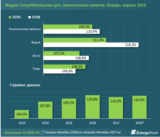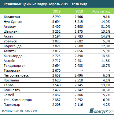 На самый быстро дорожающий вид алкоголя — водку — в среднем по Казахстану к маю 2019 года цены выросли на 1,1% за месяц и на 9,1% — за год, до 2798,6 тг за литр.