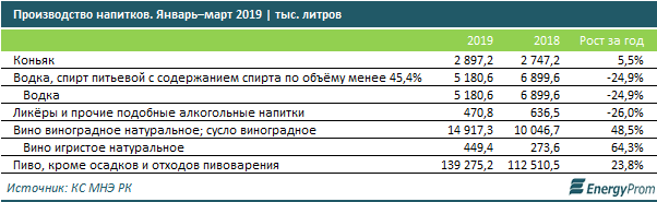 За I квартал текущего года выпуск большинства крепких алкогольных напитков увеличился. Так, производство коньяка выросло на 5,5% за год, до 2,9 млн литров, вин — сразу на 48,5%, до 14,9 млн литров, пива — на 23,8%, до 139,3 млн литров. В то же время непосредственно выпуск водки сократился сразу на 24,9%. Также в минусе производство ликёра: на 26% за год, до 470,8 тыс. литров.