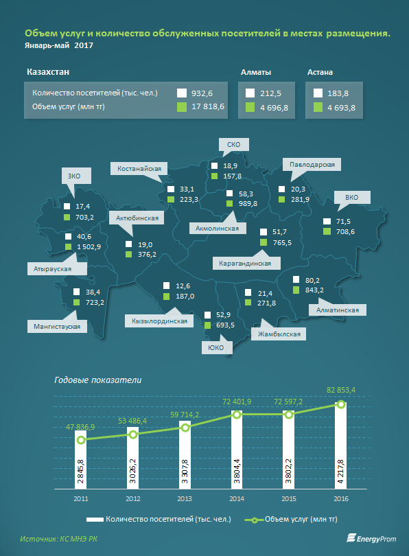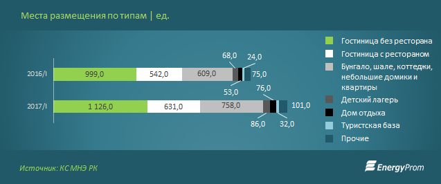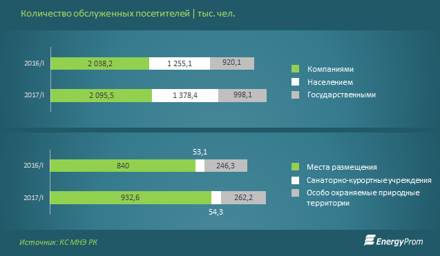 Гостиницы, дома отдыха, турбазы, коттеджи, шале и прочие места размещения в РК приняли за 1 кв. 2017 года 932,6 тысячи посетителей — как внутренних, так и внешних туристов (+11% к аналогичному периоду годом ранее). На 2,3% увеличилось количество посетителей санаторно-курортных учреждений, и на 6,5% — число посетителей особо охраняемых природных территорий.