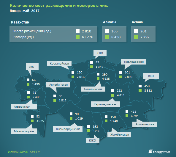 Лидирует по количеству номеров, готовых принять туристов, Алматы (13,8% от РК, 8,43 тыс. номеров, +8,8% за год), далее — ВКО (13,7% от РК, 8,38 тыс. номеров, +19,7% за год), Астана (11,9% от РК, 7,29 тыс. номеров, +19,8% за год) и Алматинская область (11,1% от РК, 6,79 тыс. номеров, сразу +37,5% за год).