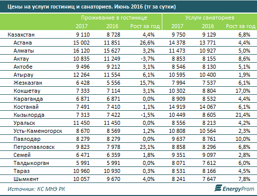 По итогам июня в Астане отмечен самый высокий рост цен на проживание в гостиницах среди крупных городов и мегаполисов РК: +23,8% к маю, и +26,6% год-к-году, до 12,12 тыс. тг за сутки. Для сравнения, в целом по стране рост цен составил +2,1% за месяц и +4,4% за год.