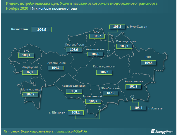 Услуги пассажирского железнодорожного транспорта по итогам ноября текущего года продемонстрировали годовой рост на 4,9%. Наибольшее годовое удорожание было зафиксировано в Восточно-Казахстанской области — на 9,6%. Удешевление услуг отмечено лишь в двух регионах: Атырауской (сразу на 12,9% за год) и Кызылординской (на 1,2%) областях.