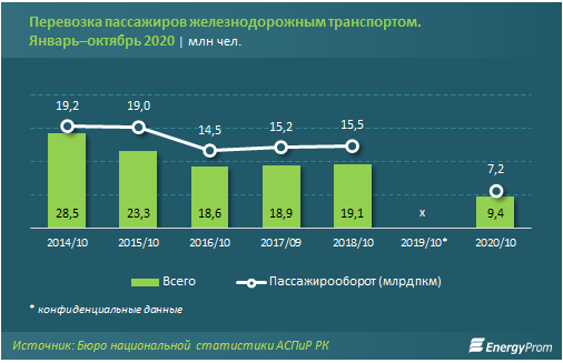 За этот период железнодорожным транспортом перевезли 9,4 млн пассажиров — на 48,6% меньше, чем годом ранее. Непосредственно в октябре пассажироперевозки составили 1 млн пассажиров, сократившись за год на 41,6%, однако увеличившись на 11,2% за месяц.