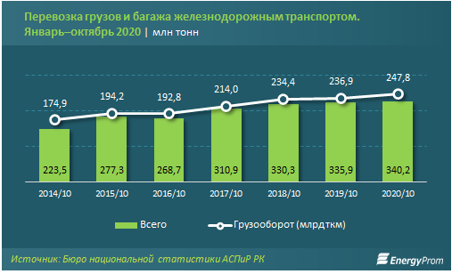 Груза и багажа перевезли 340,2 млн тонн — на 1,3% больше, чем годом ранее. В октябре текущего года грузоперевозки составили 37,8 млн тонн, увеличившись на 0,6% за год и на 7,3% — за месяц.