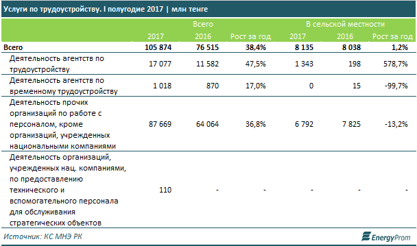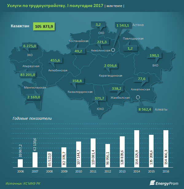 По итогам первого полугодия услуги по трудоустройству составили по стране 105,9 миллиарда тенге — это сразу на 38,4% больше, чем в аналогичном периоде годом ранее. Из них на сельскую местность пришлось 7,7%.