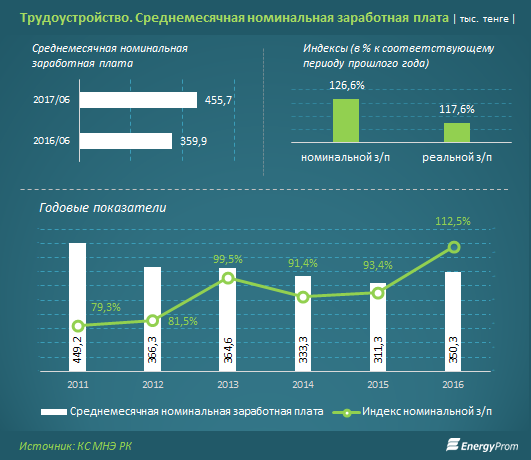 Так, по итогам первого полугодия работники сферы трудоустройства получали в среднем 455,7 тысячи тенге в месяц — это на 26,6% больше, чем в аналогичном периоде годом ранее. С учетом инфляции, покупательская способность зарплат в секторе выросла на 17,6%.