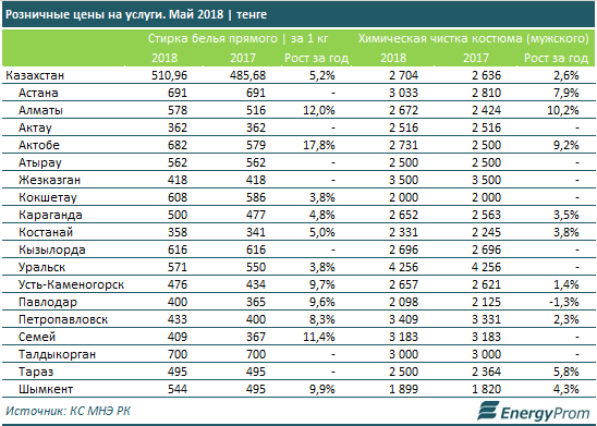 По итогам мая услуги прачечных (стирка прямого белья) подорожали на 5,2% за год, до 511 тг за килограмм белья.