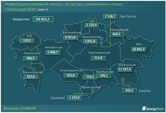 За первое полугодие текущего года в сферу искусства и досуга проинвестировали уже 54,5 миллиарда тенге — на 32,6% больше, чем годом ранее (ИФО — 127,7%).