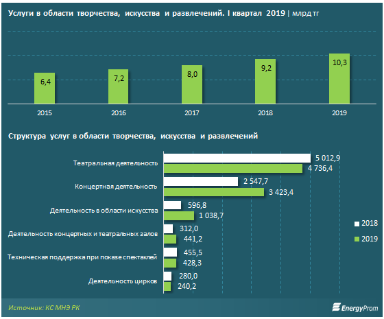 Наибольший объём услуг пришёлся на театральную деятельность: 4,7 млрд тг (−5,5% за год). На концертную деятельность пришлось 3,4 млрд тг — сразу на 34,4% больше, чем в аналогичном периоде годом ранее. Услуги в области искусства составили 1 млрд тг (+74% за год).