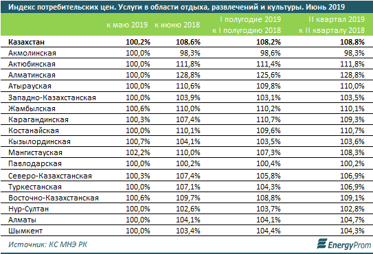 По итогам июня казахстанцам пришлось платить за услуги в сфере отдыха, культуры и развлечений на 0,2% больше, чем месяцем ранее, и сразу на 8,6% больше, чем год назад.