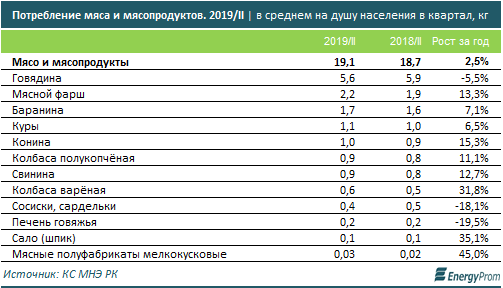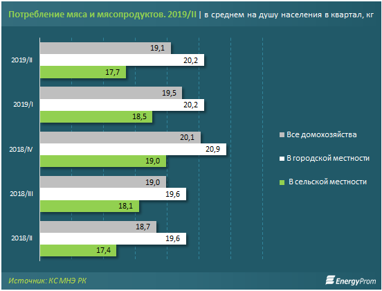 Потребление мяса и мясопродуктов всеми домохозяйствами за последний квартал сократилось на 1,8% и составило за второй квартал 2019 года 19,1 кг в среднем на душу населения. В сельской местности сокращение было ещё заметнее: на 4,5%, до 17,7 кг, при этом в городской местности рост был незначительным — на 0,05%, до 20,2 кг.