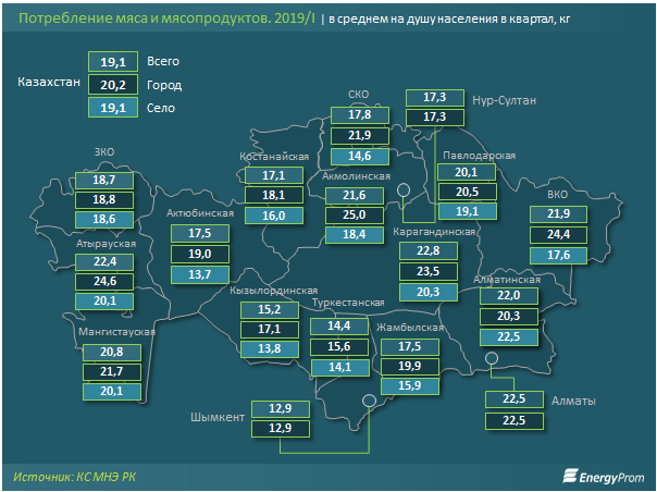 Среди регионов РК наибольший объём потребления мяса и мясопродуктов всеми домохозяйствами в среднем на душу населения во втором квартале наблюдался в Карагандинской области: 22,8 кг. На втором месте Алматы: 22,5 кг, на третьем — Атырауская область: 22,4 кг.