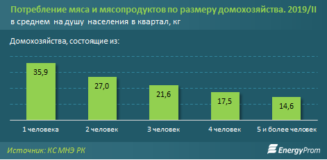 Потребление мяса и мясопродуктов в среднем на душу населения в домохозяйствах, состоящих из одного человека, составило 35,9 кг, при этом чем больше людей в домохозяйстве, тем меньше потребление мяса и мясопродуктов. Так, домохозяйства, состоящие из двух человек, в среднем употребили за второй квартал 2019 года 27 кг мяса и мясопродуктов на каждого; из трёх — 21,6 кг, из четырёх — 17,5 кг; из пяти и более человек — лишь 14,6 кг на каждого в среднем на душу населения.