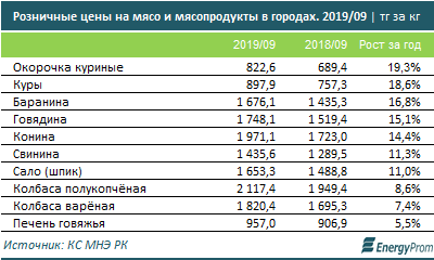 За год выросли цены на все виды мяса и мясопродуктов. Заметнее всего подорожали куриные окорочка: на 19,3%, до 822,6 тенге за кг на конец сентября 2019 года. Мясо курицы подорожало на 18,6%, до 897,9 тг за кг, баранина — на 16,8%, до 1676 тг за кг. Самое популярное у казахстанцев мясо — говядина — подорожало на 15,1%, до 1748 тг за кг.