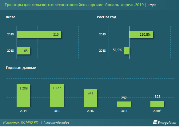 За январь–апрель текущего года выпуск тракторов для сельского и лесного хозяйства увеличился в 3,3 раза за год, до 215 штук. Для сравнения: годом ранее выпуск тракторов составил 65 штук — почти на 52% меньше, чем в аналогичном периоде 2017 года.