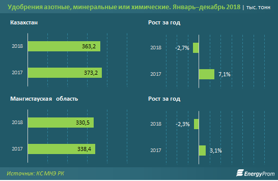 По итогам 2018 года в Казахстане произвели 363,2 тысячи тонн азотных удобрений — почти на 3% меньше, чем годом ранее. Примечательно, что по итогам первого полугодия 2018 года выпуск азотных удобрений по РК ещё превосходил производство в аналогичном периоде 2017-го на 2%. Спад начался во втором полугодии.